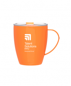 12 oz double wall 18/8 stainless steel thermal mug with copper vacuum insulation, clear acrylic push-on lid, and matching swivel; Hand wash recommended; Do not microwave; 4-7/16" h x 4"w (4-7/8 with handle) ; 355mL.