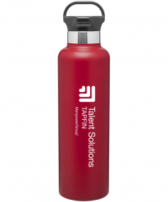 24 oz powder coated double wall 18/8 stainless steel thermal bottle with copper vacuum insulation, threaded gear-shaped insulated lid and carrying handle Complies with FDA, Prop 65. 11.25" H x 3" W