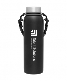32 oz double wall 18/8 stainless steel thermal bottle with copper vacuum insulation, insulated stainless steel threaded lid, silicone ring, removable strap with buckles, removable clasps, and powder coated finish. Individual gift box. Hand wash recommended. Do not microwave. Complies with FDA, Prop 65. 11" H x 3.1875" W