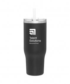 40 oz double wall 18/8 stainless steel thermal tumbler with copper vacuum insulation, stainless steel rim, dual-purpose push-on clear lid, matching sliding closure, flexible wide silicone straw, and powder coated finish
