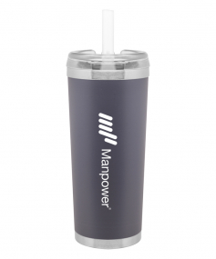24 oz double wall 18/8 stainless steel thermal tumbler with copper vacuum insulation, stainless steel rim and base, threaded Eastman Tritan lid, snap closure, straw opening, and flexible wide silicone straw.