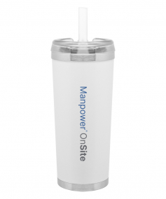 24 oz double wall 18/8 stainless steel thermal tumbler with copper vacuum insulation, stainless steel rim and base, threaded Eastman Tritan lid, snap closure, straw opening, and flexible wide silicone straw.