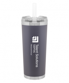 24 oz double wall 18/8 stainless steel thermal tumbler with copper vacuum insulation, stainless steel rim and base, threaded Eastman Tritan lid, snap closure, straw opening, and flexible wide silicone straw.