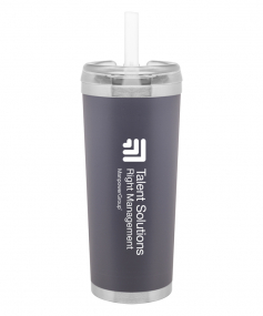 24 oz double wall 18/8 stainless steel thermal tumbler with copper vacuum insulation, stainless steel rim and base, threaded Eastman Tritan lid, snap closure, straw opening, and flexible wide silicone straw.