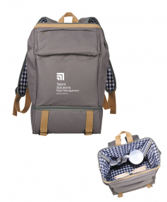11pc Café Picnic Backpack for Two. The main compartment has a wide opening to easily access the picnic pieces. The separate PEVA insulated cooler storage compartment fits 6 cans. Set includes 2 each: 8" plates, mugs, forks, spoons, and napkins. Complies with Prop 65. 16.5" H x 9.5" W x 6.25" L