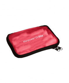 Vinyl case with zipper includes a 12 hour safety light stick, 10 latex-free bandages, 5 snip bandages, two 2" x 3" adhesive pads, 2 knuckle bandages, 5 antiseptic towelettes, 5 first aid cream packets, 2 non-adhesive pads, 1 gauze roll, 1 roll of adhesive tape, and 1 first aid guide.