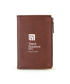 Stylish executive notebook with PU/split leather outer and suede inner cover. Features large zipper pocket (fits up to iPhone 7S Plus). Includes 80-sheet replaceable notebook. 5 3/4" H x 8 1/2" H