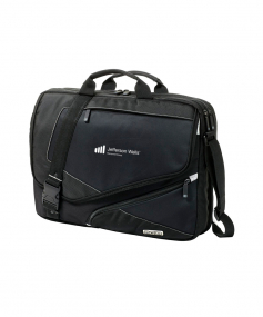 Fits most 17" laptops. Organizer panel with pen loops, padded external hard drive pocket. ID card pocket. Front zippered pocket for small items. Hidden magazine compartment. Pullman handle attachment sleeve. Laptop sleeve: 12.75"x16"x1.25". Fits most 17" laptops. 17" W x 14" H x 4" D.